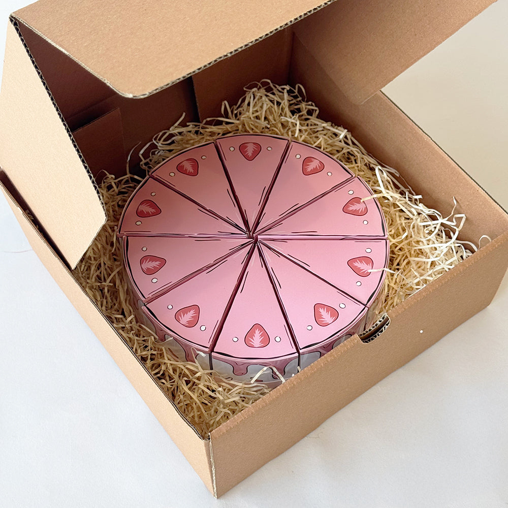 عشر علب بشكل شرائح كعك مثلثة، مربوطة بشريطة لتكوّن كعكة متكاملة.