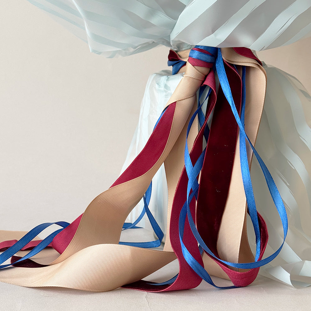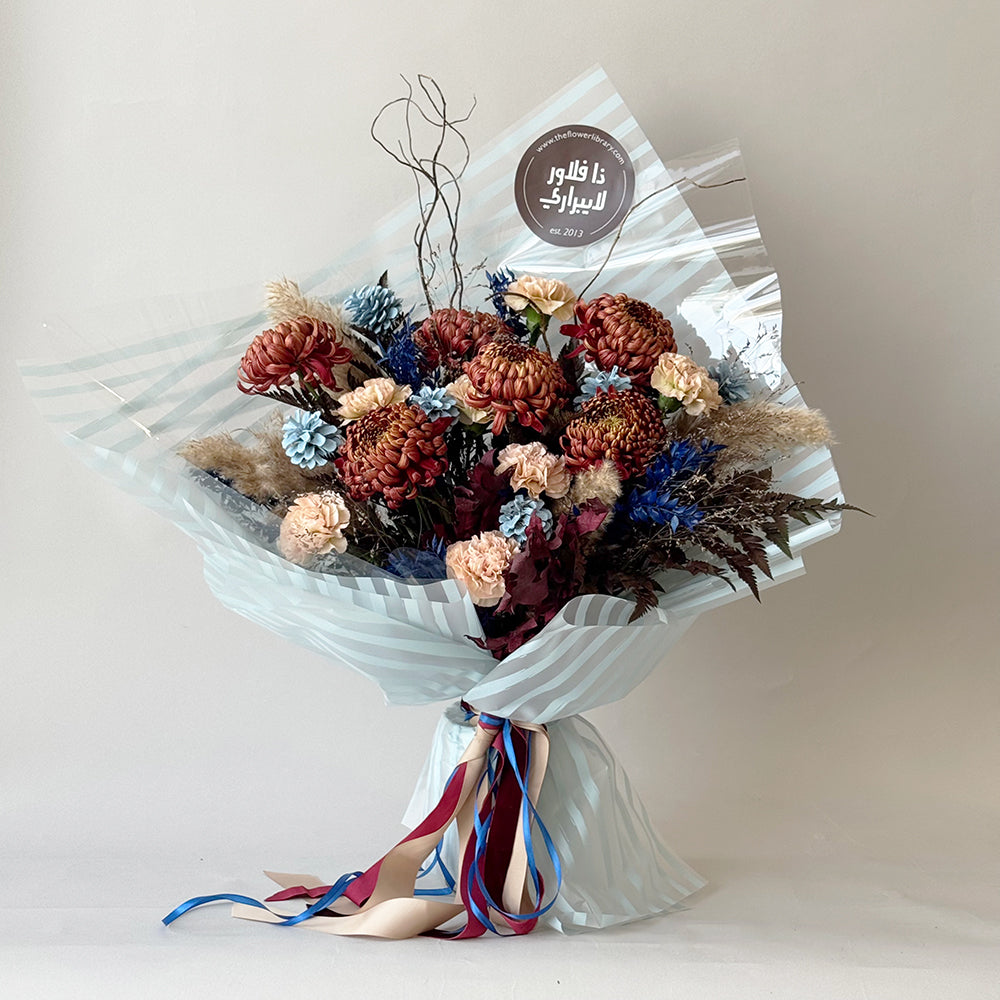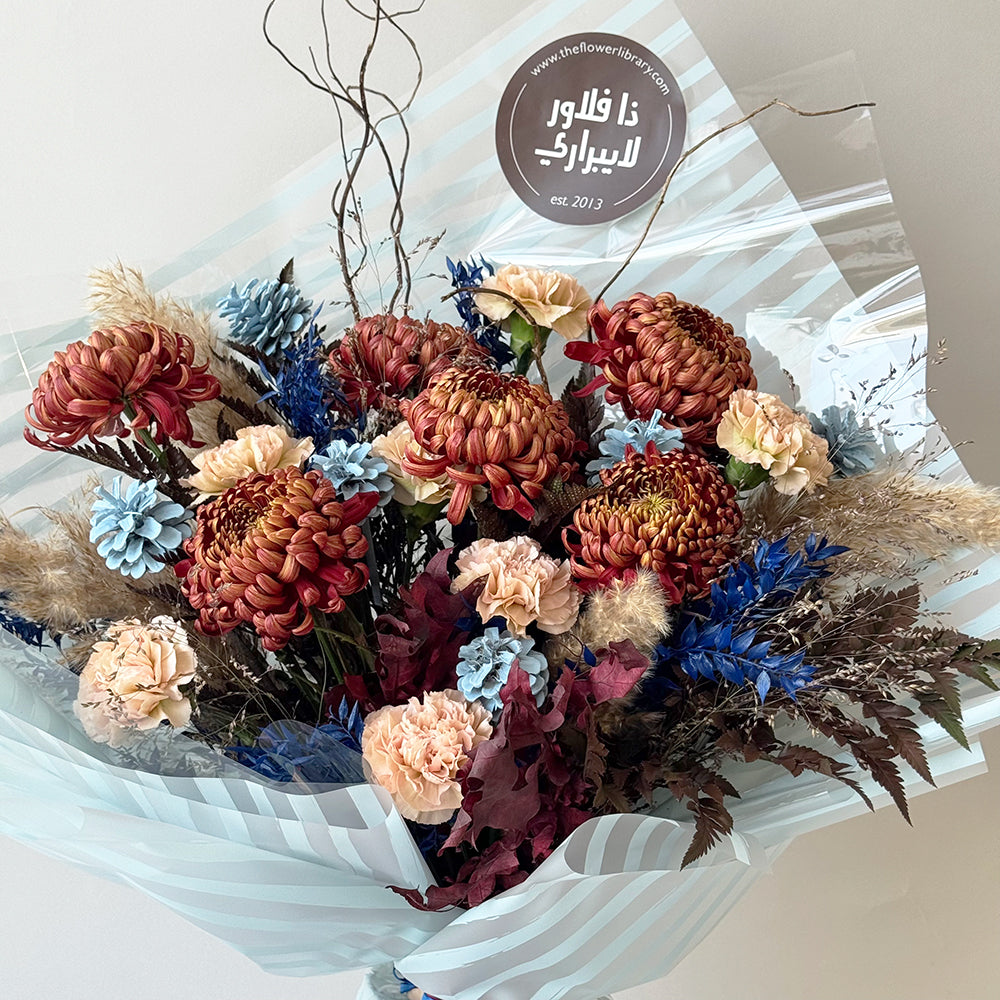 A bouquet of fresh and preserved flowers, featuring hand-painted blue pine cones and wrapped in our eco-friendly frosted striped paper.