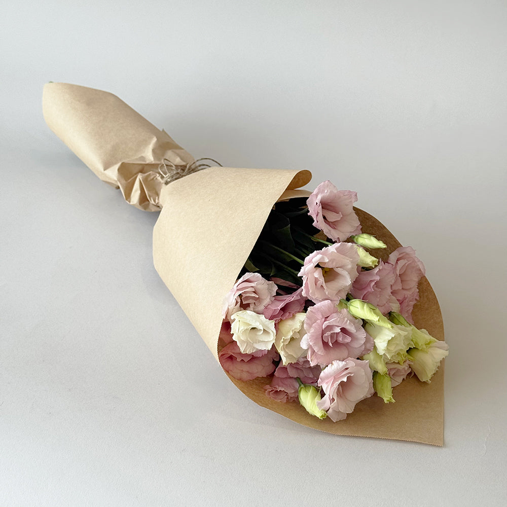 باقة من ١٠ أعواد زهرة الأوستوما ملفوفة بورق بني.