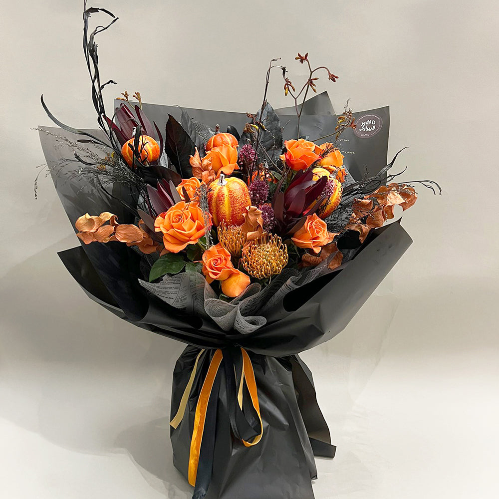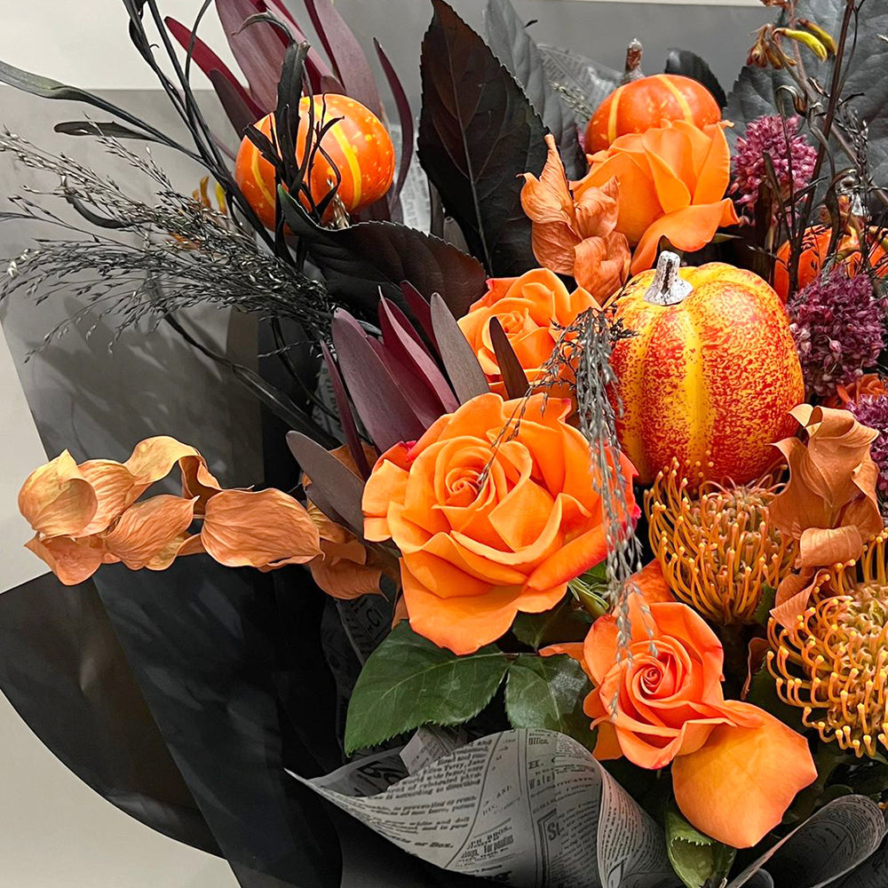 An outstanding winter bouquet where elegance meets spooky — made of fresh and painted flowers and leaves, with artificial pumpkins.